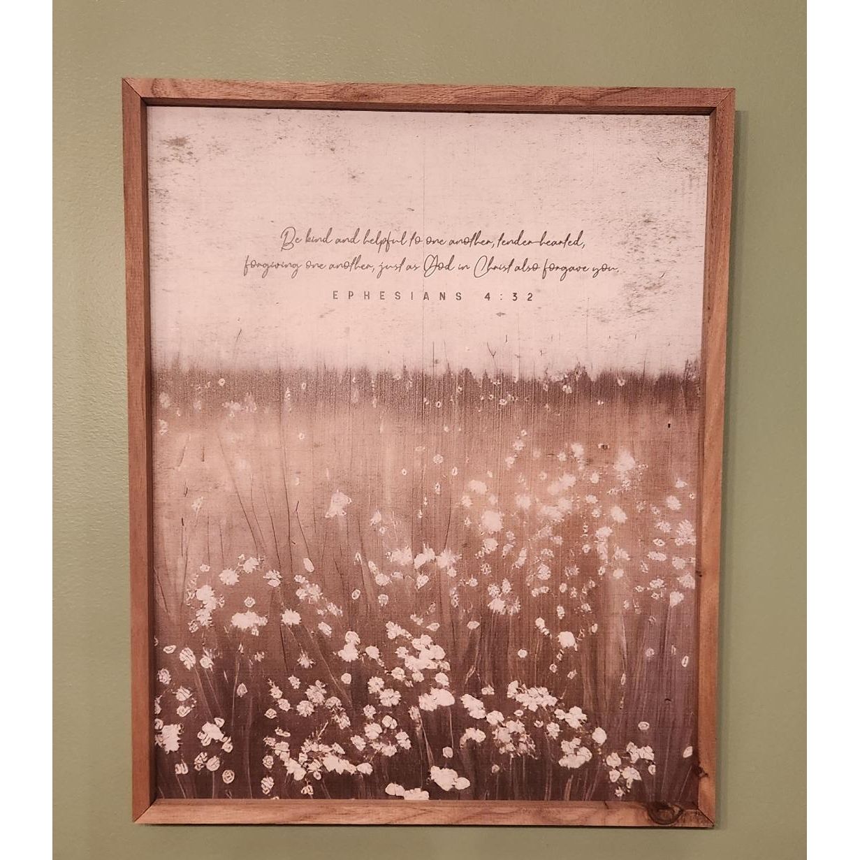 This unique piece is a simple way to bring beauty and charm to any wall within the home. It is made from high quality American hardwood and showcases a field of white daisies and the command to "Be kind and helpful to one another, tenderhearted, forgiving one another, just as God in Christ forgave you. Ephesians 4:32". Each piece has its own personality (re: wood markings, etc.), as well as easy to clean with a dry cloth and measures 16"Wx20"H.