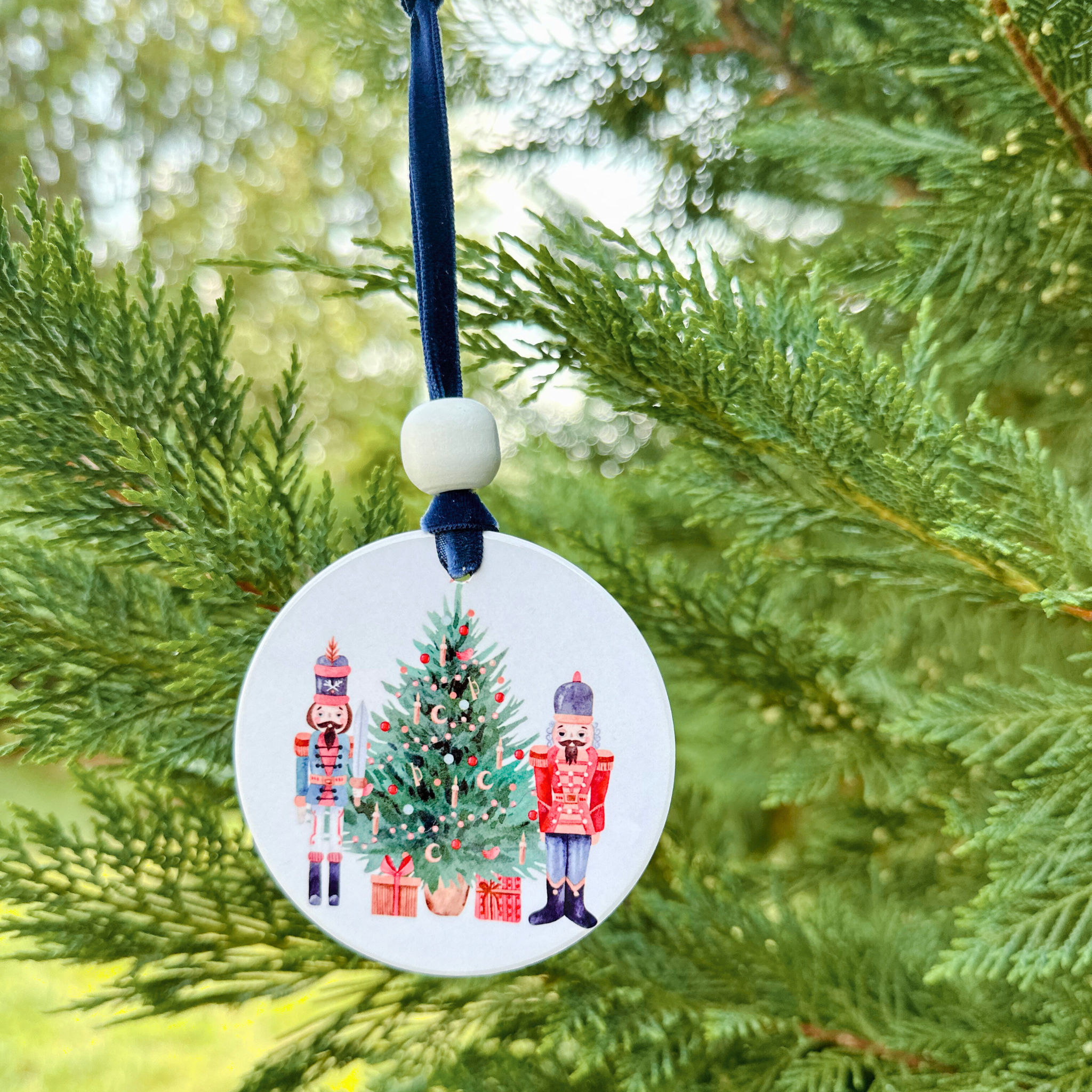 Made and packaged in our NC, our 3"H x 3"W x 0.2"D round ceramic ornaments have a glazed image on the front and blank on the back. This ornament features traditional holiday icons with a lovely old-fashioned Christmas tree flanked by majestic nutcracker soldiers. It comes with a colored velvet ribbon and a white distressed wood bead. These ornaments are loved by all!