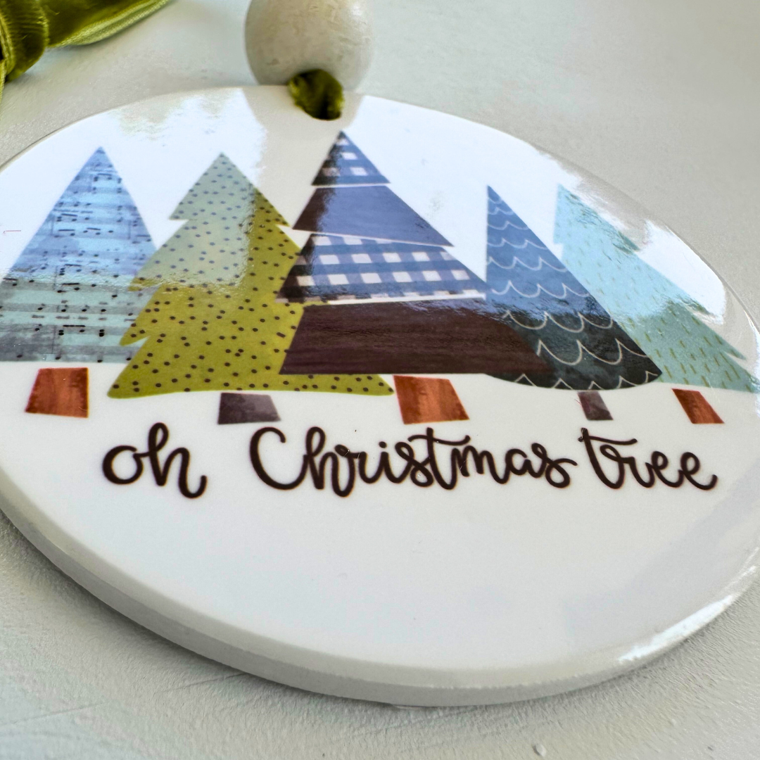Made and packaged in our NC, our 3"H x 3"W x 0.2"D round ceramic ornaments have a glazed image on the front and blank on the back. This whimsical collection of Christmas Trees pays homage to the holiday classic, O Christmas Tree. It features a variety of holiday trees dressed in festive cheer on a crisp white background. They come with a colored velvet ribbon and a white distressed wood bead. These ornaments are lovely and will bring delight to one and all!