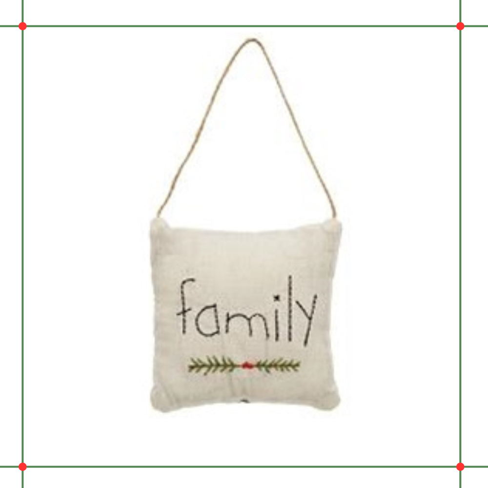 Our "Family" Mini-Pillow Ornament is a stuffed fabric pillow ornament with an embroidered design and jute hanger. It has a green back and the front read, "family" in black text with embroidered holly bough accent. Measures 3.75" x 3.75". Adorable on your Christmas Tree, cute on your door knobs or hang from decorative hooks around the house.