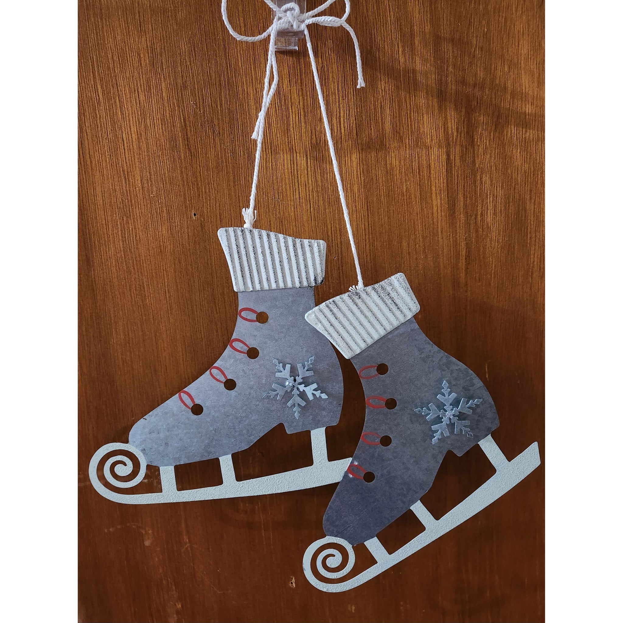 The Galvanized Skate Ornament brings a vintage-inspired accent to a Christmas tree or winter hanging decor. Crafted from metal with layered design, the ornament depicts a pair of classic ice skates. The skates feature a galvanized finish and are accented by a textured cuff and a cutout snowflake. The blades of the skates have a swirled accent and glittered finish for an eye-catching look. A hanging string allows for versatile display. Measures 10" high by 11" wide.