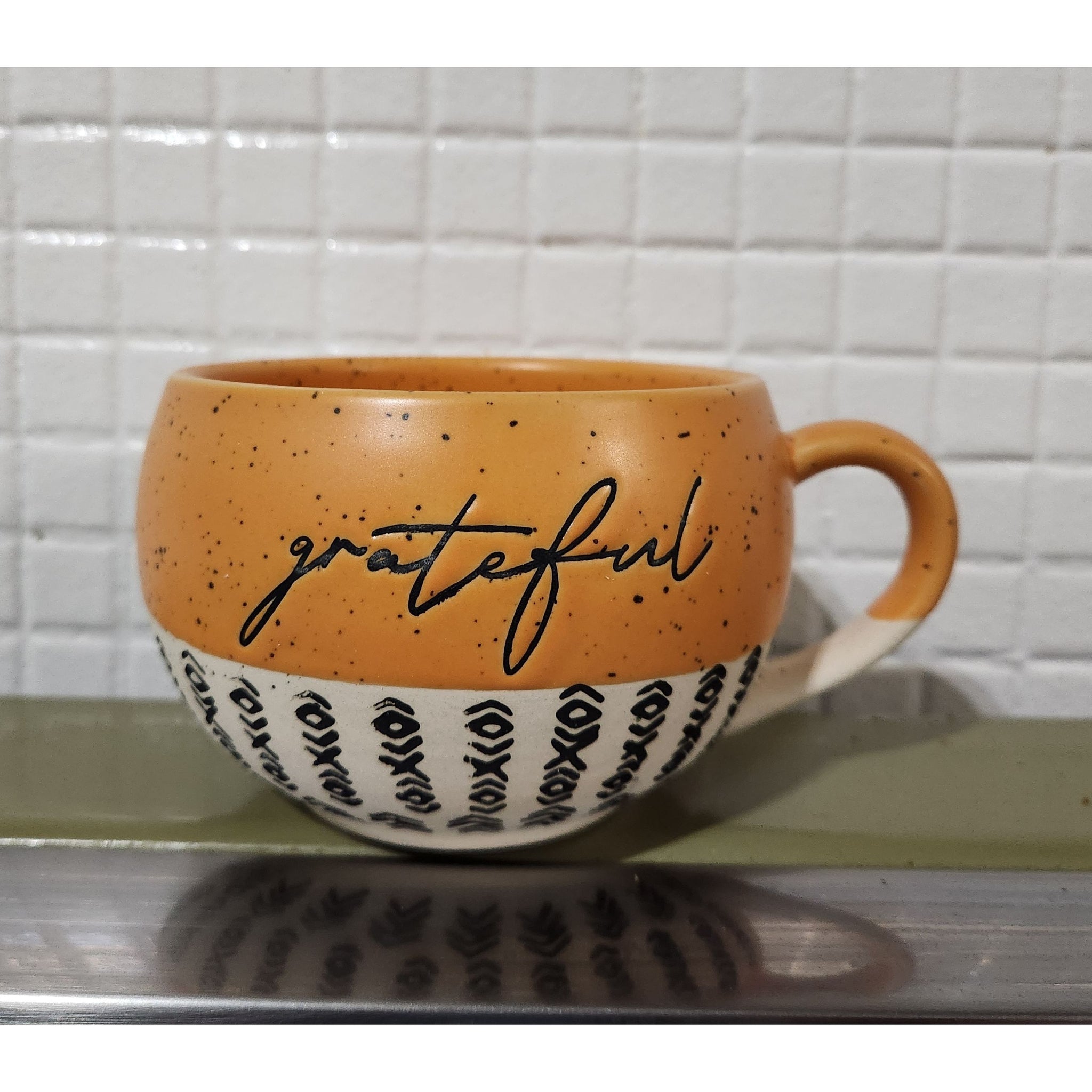 Handcrafted in natural stoneware with a colorful glaze, this jumbo size mug is perfect for your daily cup of joe or as a soup mug. As an extra touch, the words are debossed on both front and back. Made of stoneware, this orange & cream mug holds 16 ozs. and is dishwasher and microwave safe.