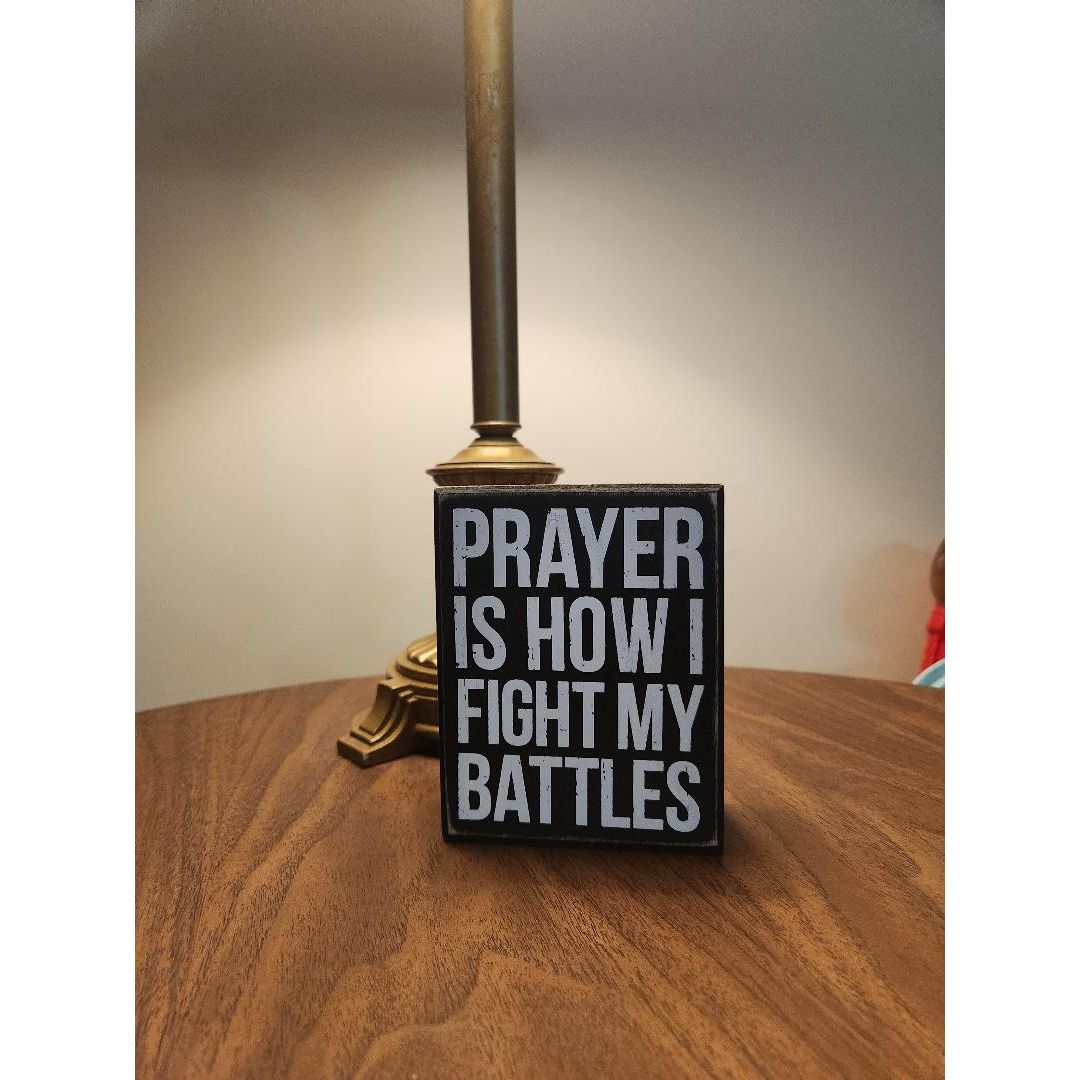 A classic black and white wooden box sign from our Box Sign Collection displaying a sassy faith inspired sentiment that reads "Prayer Is How I Fight My Battles." Faith box sign features distressed details with coordinating black color on sides and back. Our Prayer Is How I Fight Battles box sign is easy to hang or can free-stand alone. A faith-themed gift that can be easily displayed in any home or work space.