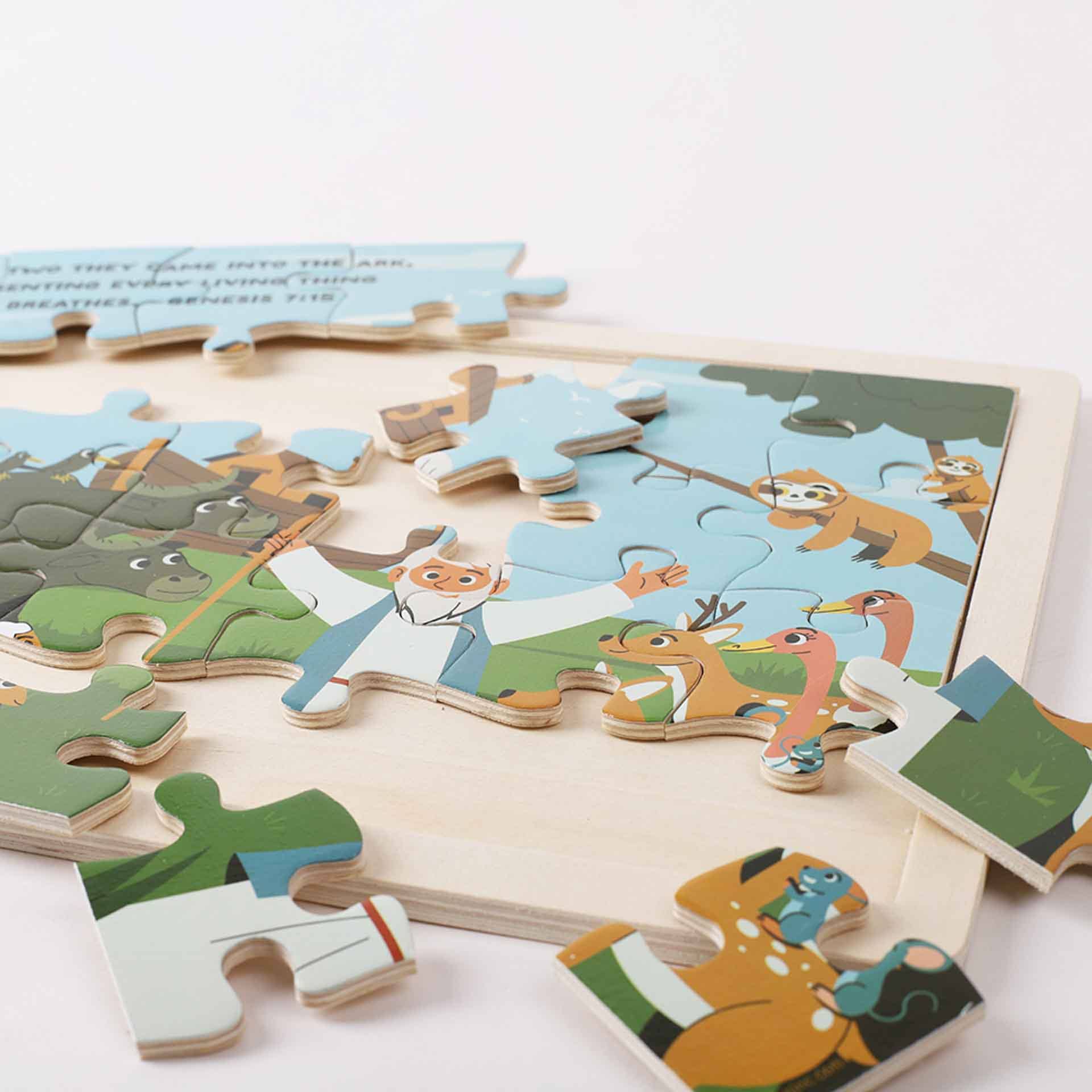 Discover the wonders of God's creation with our newest wooden puzzle! This educational toy is designed to engage young minds as they learn about the story of Noah's Ark in a fun and interactive way. Each carefully crafted puzzle piece represents a section of the puzzle, and by putting each piece together, the story comes together! With its vibrant colors and kid-oriented imagery, this puzzle brings the story to life. Not only does this puzzle provide a valuable learning experience, but it also promotes the development of motor skills and hand-eye coordination. The smooth wooden shapes are designed with safety in mind, making it suitable for children of all ages. Measuring 11.875" x 0.325" x 8.75" (L, W, H), this puzzle is the perfect size for little hands to grasp and manipulate with ease. Its compact dimensions make it ideal for both home and travel, ensuring that learning never stops. Introduce your child to classic Bible Stories with this Noah's Ark themed Puzzle.